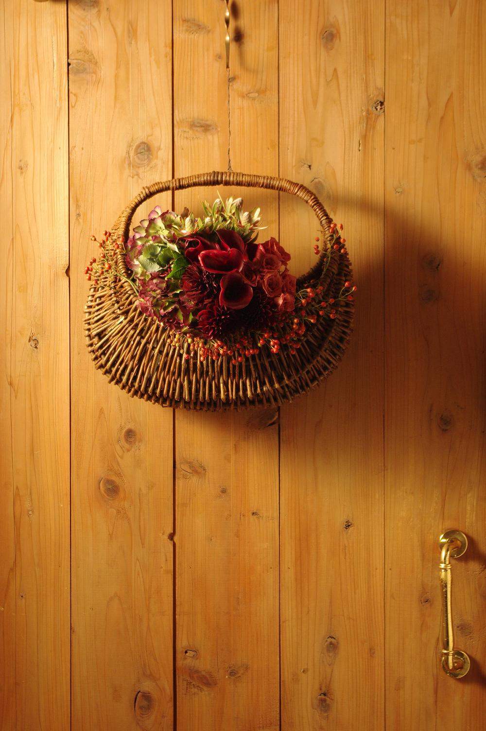 ドアにバスケットをかけてドア飾り風アレンジ。